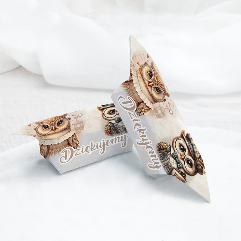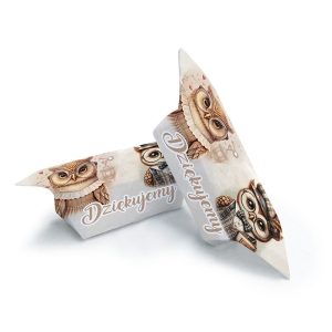 Grafika przedstawiająca sowę w okularach i kapeluszu dodaje opakowaniu elegancji, ale też odrobiny humoru. Napisy „Dziękujemy” wzmacniają przekaz. Krówki mają klasyczny mleczy smak. Każdy cukierek jest zawinięty w starannie zaprojektowany papierek. Podziękowanie dla nauczycieli w takiej formie może być samodzielnym prezentem lub częścią większego zestawu z kwiatami, laurką lub książką. Co ważne, krówki doskonale nadają się również do rozdania całemu gronu pedagogicznemu – forma i estetyka są odpowiednie dla każdego wieku i przedmiotu nauczania.