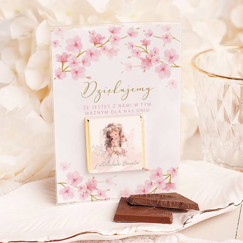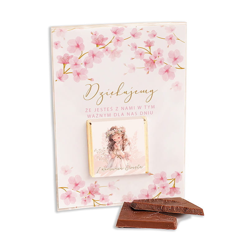 Czekoladka z bilecikiem to eleganckie podziękowanie dla gości na Pierwszą Komunię Świętą. Subtelny motyw różowych magnolii, pastelowa estetyka i aksamitna mleczna czekolada tworzą wyjątkowy upominek, który podkreśli uroczysty charakter tego dnia.