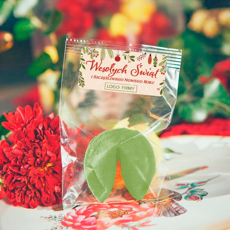 Zestaw oferuje 10 spersonalizowanych ciasteczek, które mogą służyć jako elegancki i pomysłowy upominek dla pracowników, klientów lub kontrahentów. Ciasteczka z wróżbą są wyprodukowane w Polsce, co gwarantuje najwyższą jakość i autentyczność. Dostępne są w różnych wariantach kolorystycznych, w tym w biszkoptowym, zielonym, różowym i niebieskim, co pozwala dopasować je do klimatu Twojego wydarzenia. Każde ciasteczko jest starannie zapakowane osobno w transparentne opakowanie, które dodatkowo ozdobione jest prostokątną etykietą. Na etykiecie znajduje się urocza grafika z gałązkami jodły i bombkami, a pomiędzy nimi umieszczony jest napis "Wesołych Świąt i Szczęśliwego Nowego Roku". Całość jest zwieńczona Twoim logotypem, który umieszczony jest w dolnej części etykiety.