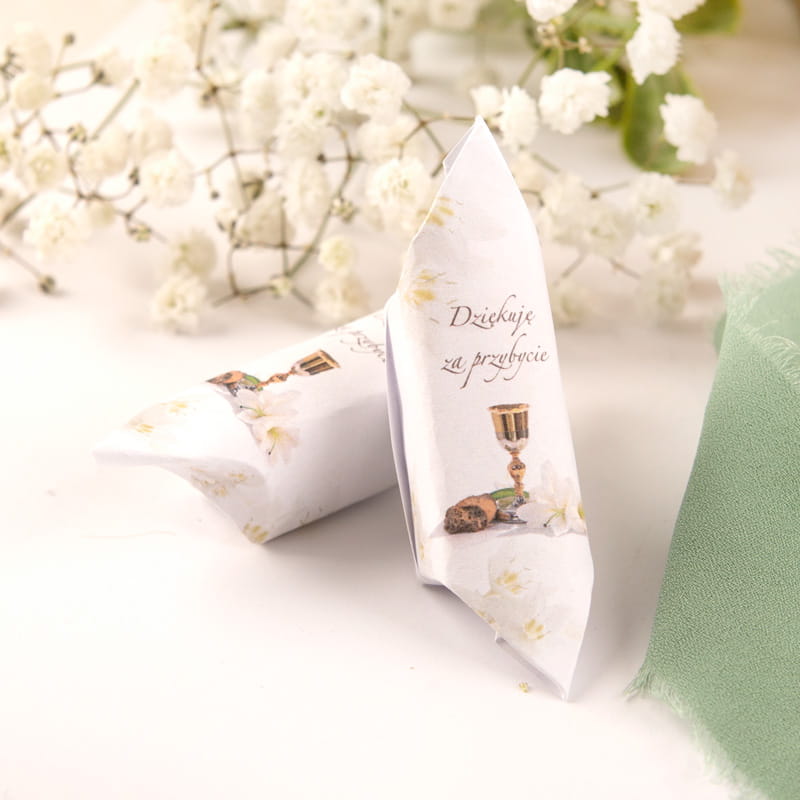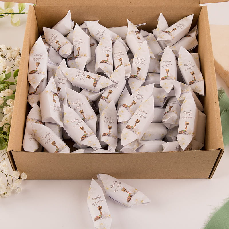 Podaruj swoim gościom niezapomnianą niespodziankę podczas uroczystości Pierwszej Komunii Świętej - krówki zapakowane w eleganckie kraftowe pudełko. Każda krówka, ozdobiona subtelnym motywem kielicha i napisem "Dziękujemy za przybycie", symbolizuje uroczysty charakter tego szczególnego dnia, będąc jednocześnie smakowitym upominkiem i piękną ozdobą stołu.