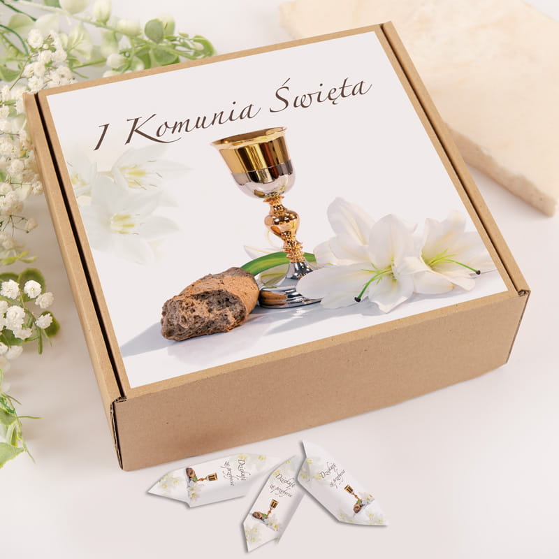 Odkryj idealny sposób, by wyrazić wdzięczność podczas uroczystości Pierwszej Komunii Świętej - eleganckie krówki w kraftowym pudełku, zdobione motywem kielicha. Wyjątkowe słodycze to nie tylko pyszna przekąska, ale także oryginalny prezent, który doda elegancji i słodkości każdej uroczystości.