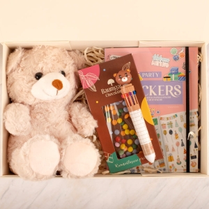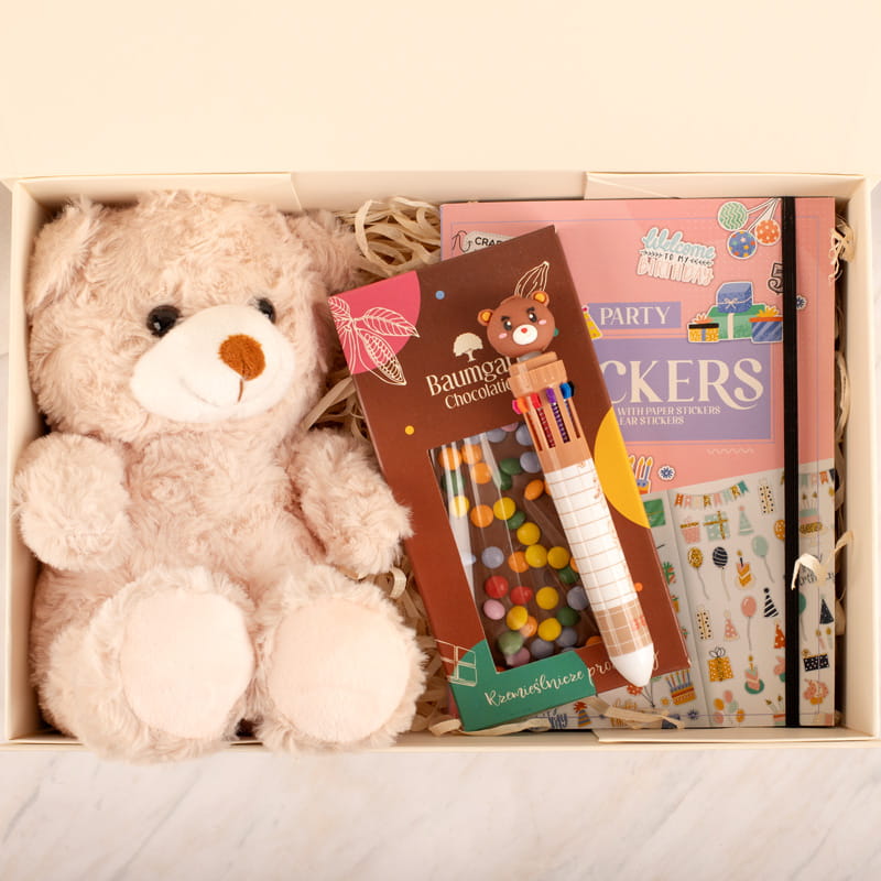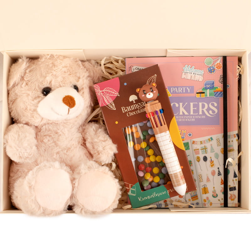 Świąteczna paczka dla dziewczynki to prawdziwy skarb pełen niespodzianek, ale również zróżnicowane i atrakcyjne upominki, które przypadną do gustu każdej małej damie. W eleganckim pudełku kryje się zestaw pełen atrakcji. Na pierwszy plan wysuwa się pluszowy miś o miękkim, jasnym futerku, który jest idealny do tulenia. W paczce znajduje się również czekolada od Baumgart Chocolatier, której kolorowe drażetki dodają świątecznego klimatu. Obok czekolady znajdziesz kreatywny zestaw, czyli książeczkę z naklejkami.