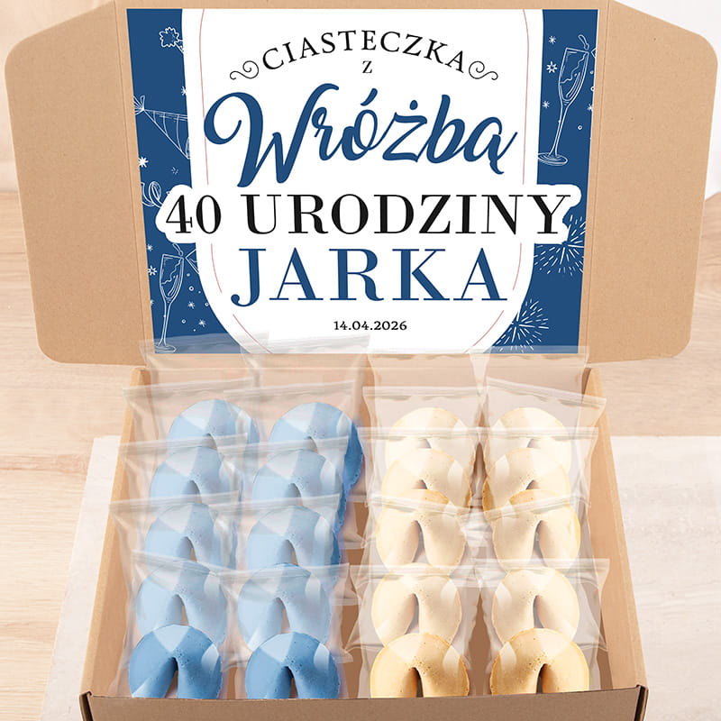 Zestaw ciasteczek z wróżbą to wyjątkowa kolekcja składająca się z 30 ciasteczek – 15 kolorowych ciasteczek (niebieskich bądź różowych) i 15 biszkoptowych. Każde ciasteczko jest starannie zapakowane w przezroczystą folię, co zapewnia świeżość i estetyczny wygląd. Opakowanie zestawu to solidne pudełko, na którego froncie znajduje się spersonalizowany napis z imieniem solenizanta oraz liczbą urodzin. Grafika na opakowaniu jest elegancka i nowoczesna, zawiera subtelne motywy, takie jak kieliszki do szampana i fajerwerki.